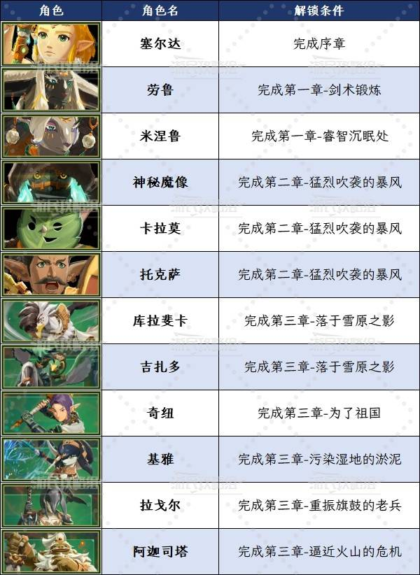 《塞尔达无双封印战记》中的可操作角色有很多,许多刚刚入坑的小伙伴可能还不太清楚这些角色什么时候解锁,下面就为大家带来《塞尔达无双封印战记》全角色解锁条件,希望对大家有所帮助。
