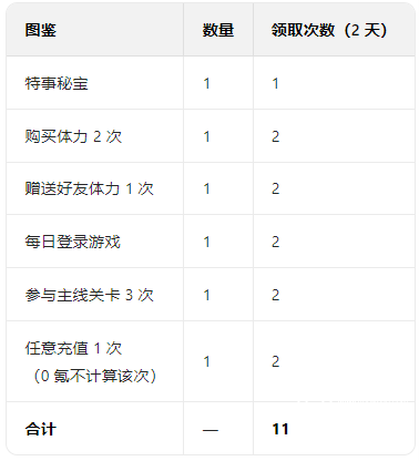 关卡双倍(每日 3 次):金色材料 3 个 / 天 ×7 天 = 21 个,紫色材料 30 个 / 天 ×7 天 = 210 个