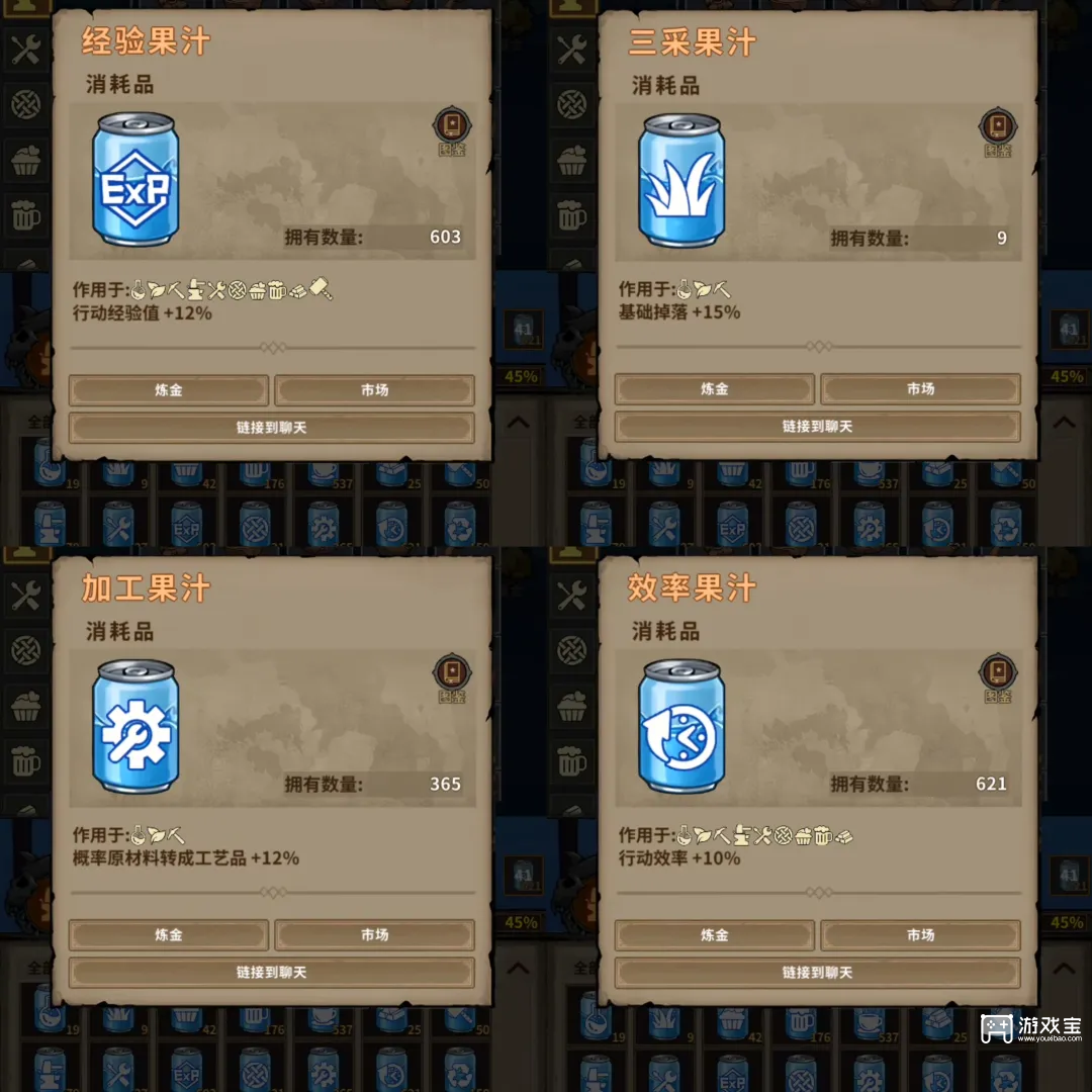 单栏:经验、职业果汁【打造,制作1.0-3.0药水】、效率、环保