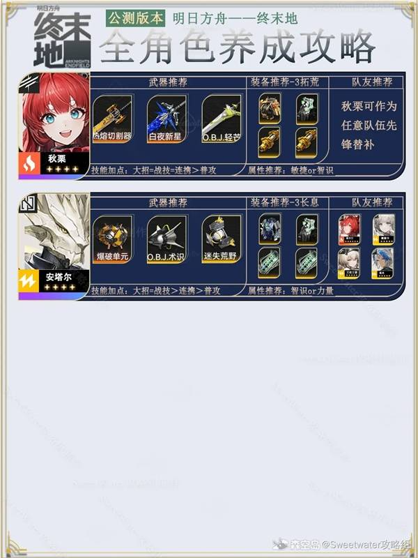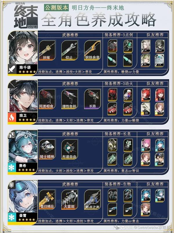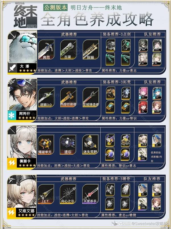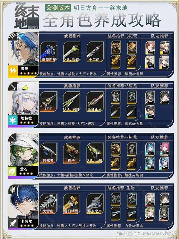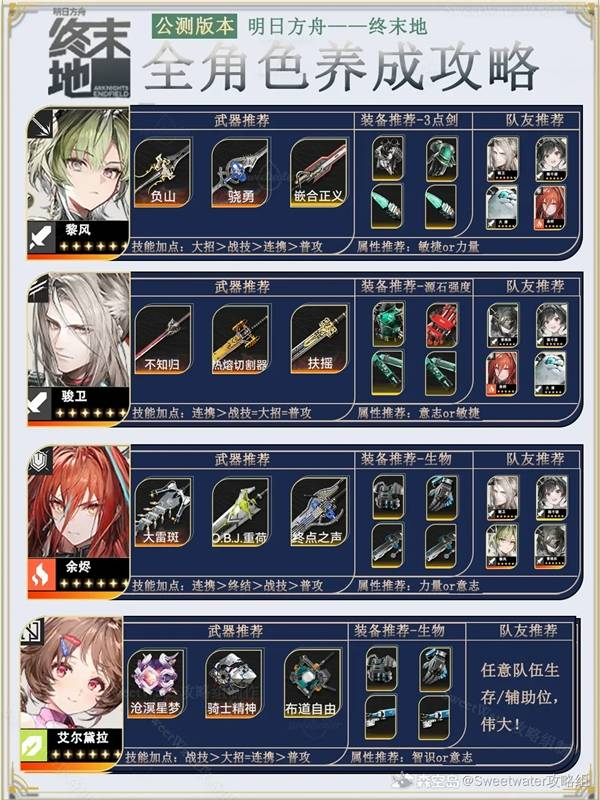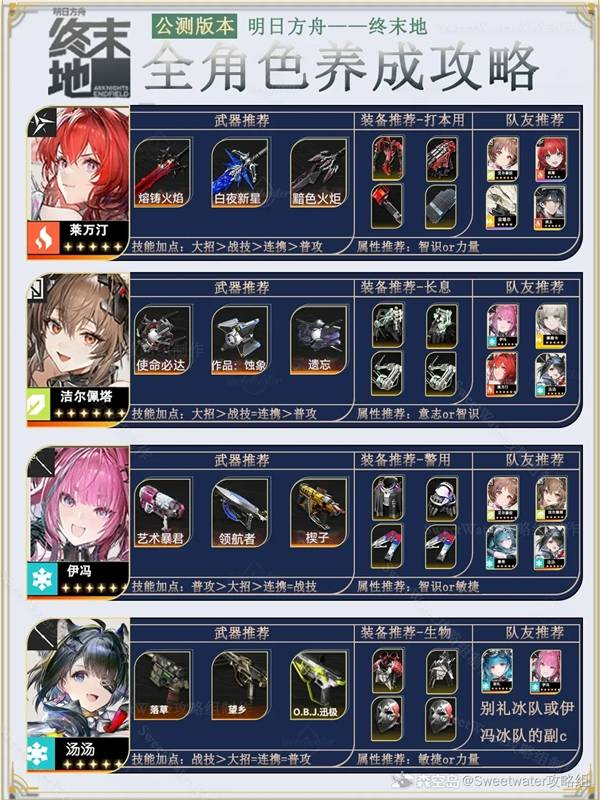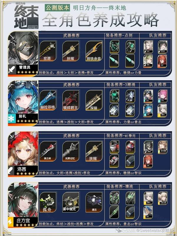 《明日方舟终末地》1.2版本增加了新的角色庄方宜,那么这个版本下各角色都要如何培养呢?下面请看由“Sweetwater攻略组”带来的《明日方舟终末地》1.2全角色养成攻略,一起来看看吧。