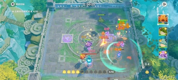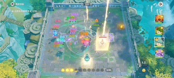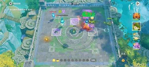 第一波我们朝左方四个小机关先使用风蕈兽的主动技能,可以指向我风眼处的那个机关。然后火蕈兽也可以释放主动技能指向残余机关