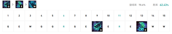 Q技能是核心输出技能必须主加,E技能则是位移和额外攻击距离也很重要,副加。最后W技能等级提升主要体现在双抗和CD,所以一点即可。