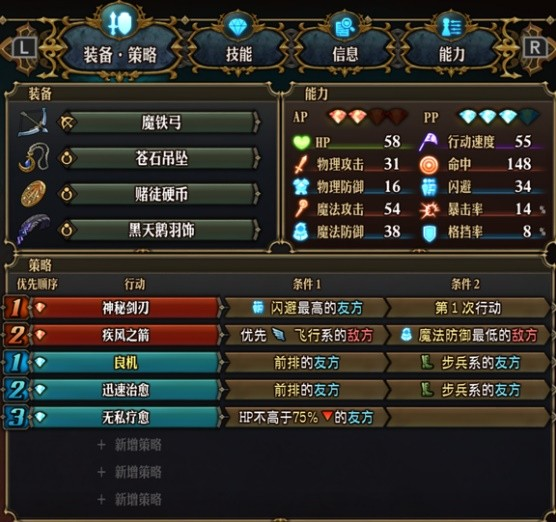 魔防尚可,不是很怕魔法攻击。物防等于没有,看似高闪避,但是中期开始有不少职业带必中。虽然拨挡能挡近战,但架不住人多,摸到一下原地去世。天敌是远程必中物攻(弓手:没错正是在下)。如果带坚韧腰带免死,PP点会不够用,最好是带一个盾职业帮挡远程物理攻击,还需要在侧妃没PP点的时候,帮挡近战物理攻击。如果不是铁卫的话,就需要用到见习骑士盾,设置上要尽量留PP点防物攻,魔法攻击可以硬抗。我带的是主角亚连,因为他魔防不错也够肉。