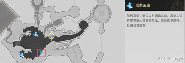 赤陶学派掌管艺术教化,滋养心灵与感知的成长,所在地为【慈爱之庭】,具体位置如图所示。赤陶学派现任贤人名为苏鲁琦珮,学派雕像应当复原。