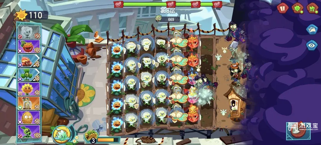用这套阵容打到打不过为止,直到出现一个新的僵尸,园艺僵尸,这个僵尸拥有斩杀效果,这个时候就要变阵容,阵容变为