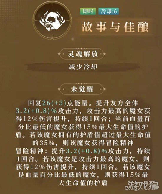 花梨的大招技能名为故事与佳酿,主要功能是能量恢复与团队增益。未觉醒时,释放该技能可恢复自身26点能量,并提升全体友方3.2%的攻击力。