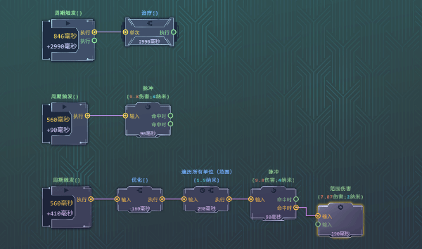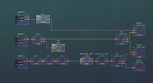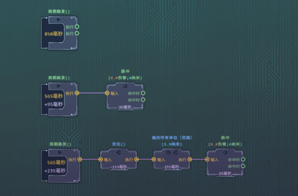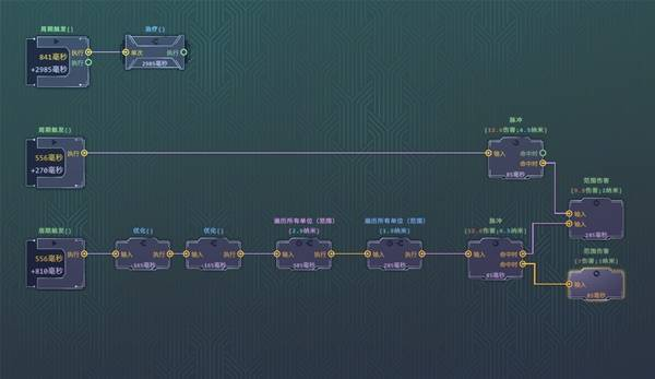 最下面整串节点搭配下来的效果能够判断周围所有单位,然后以他们为执行器每个敌人都对其他敌人射出一道脉冲,周围敌人多的时候很好用,不如范围伤害但是也有一定的处理能力。