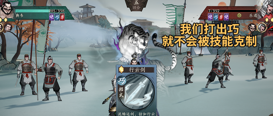 在准备阶段,我们可以看到对面的“手牌”配置,从而出招应对。举例:对面手牌有一个巧技能(蓝牌)、一个勇技能(红牌),那么只要我们打出蓝牌,在技能对拼时,最坏的结果也是平手。同样的,如果对面手里全是优势牌,我们也可以用绝招来压制。