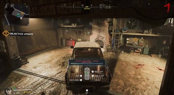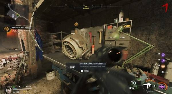 恢复供电后,会开启一扇位于灰木镇主入口前方车库门。沿着来时上桥的升降机返回,将【老特西】开进车库。在车库内可以找到一个载具升级站,与它互动即可将强化机安装到【老特西】上。之后找到的所有【老特西】升级也都需要在此处进行。