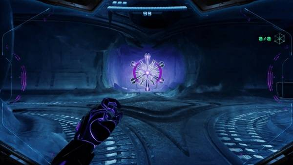 首先找到心灵锁右侧带有裂纹的强化玻璃,击碎玻璃后进入后方的准备走廊(Staging Corridor)。走到走廊尽头的房间,找到被闸门挡住的变形球通道(Morph Ball vent),击碎闸门后滚动通过,扫描桌上的直立容器即可获得密码碎片。