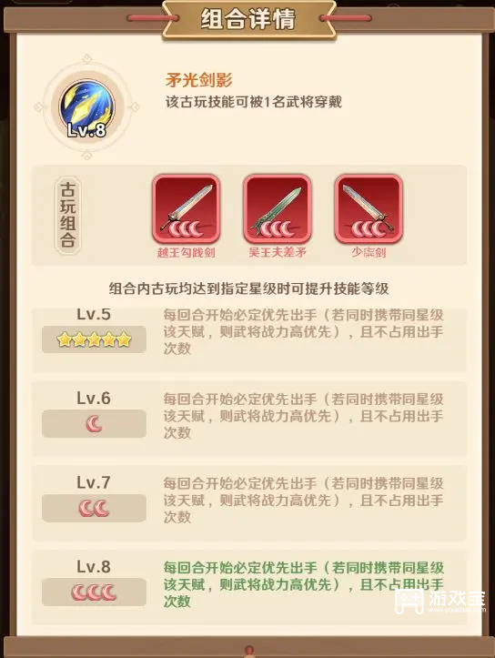 由越王勾践剑和吴王夫差矛、少虡剑激活组成的矛光剑影:每回合开始必定优先出手(若同时携带同星级该天赋,则武将战力高优先),且不占用出手次数。