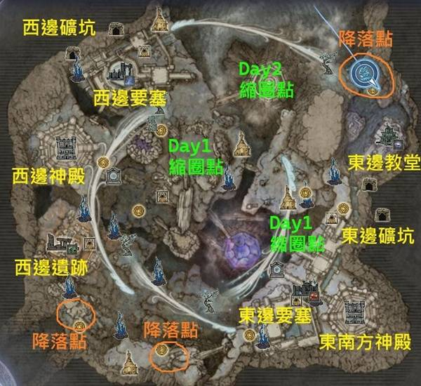 如果第一天火力十分足够且拿取大水晶buff,可以选东边或西边的要塞+神殿为最终目标,并预留时间跑图至决赛圈。