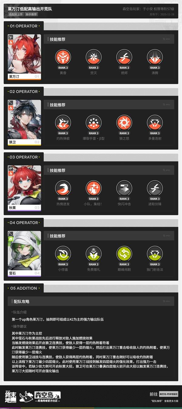 《明日方舟终末地》三测的莱万汀是一名六星火属性角色,那么莱万汀如何构筑高输出的队伍呢?下面为大家带来《明日方舟终末地》莱万汀低配高输出配队,一起来看看吧。