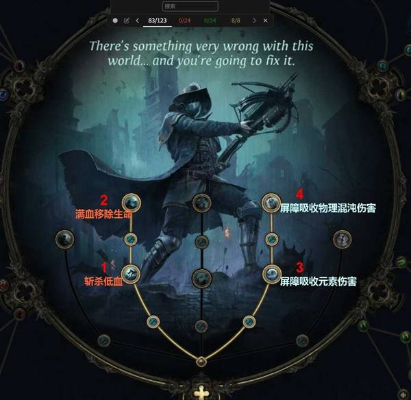所以生存非常重要。猎魔人的护盾可以轻松堆到大几千,而且可以抵御物理、元素、混沌伤害,盾即使破了,CD一到立即回满。唯一的弱点是点燃、流血、中毒等持续伤害,但猎魔人附近的天赋点恰好可以让你对这些持续伤害全部免疫,实现360度立体防御。大家可以看我让boss打都不怎么少血的,而且奔跑被击倒,被围殴也能毫发无伤,慢悠悠拍拍屁股站起来。大家都知道,一般职业奔跑被击倒基本必死,只能esc卡bug。