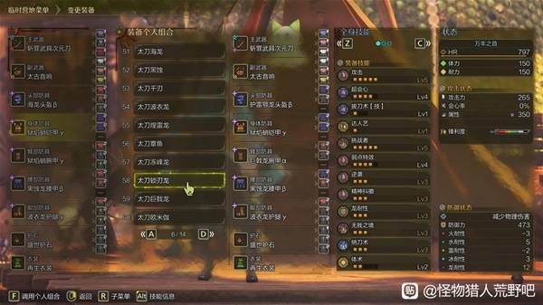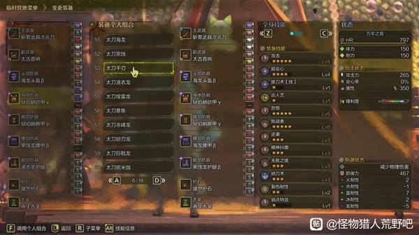 石选攻2拔刀1挑战1或达人艺挑战1(肉质太差需要出心眼)。武器用巨戟龙强化后的拼好刀,词条洗黑蚀+霸主之魂,属性激化,4攻1斩,221。