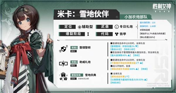 而另一位限定角色米卡就简单许多了,她的特色在于二技能附带的爆裂速冲和爆裂技能的解debuff,简单来说就是没啥用仓管定位,在个突中也很难上场,当时抽取了的玩家纷纷大呼上当受骗,显然默默吃了苦头的策划们也是不想让国服玩家再受此之苦,贴心的全员免费赠送了这位限定妮姬,单纯拿来收藏也是很可爱的~!