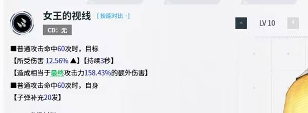 她的技能组简单却实用,作为核心的一技能提供了易伤buff和补弹两个效果,前者可以让她适配任何队友,哪怕是后面数值更高的角色上来,女王也可以担任合格的副c,而女王的技能都是需要叠层(命中60次)才可以触发,补弹buff能很好让她的火力全程覆盖,并且此效果还可以配合拥有补弹buff的队友(如黑白兔)和补弹魔方(战术巨熊魔方)达到1+1>2的效果,几乎可以让女王全程不换弹。而二技能和爆裂技能则提供了稳定的自身buff来保持伤害,女王也是一名全程交给电脑自动auto输出的角色即可 非常的省心。