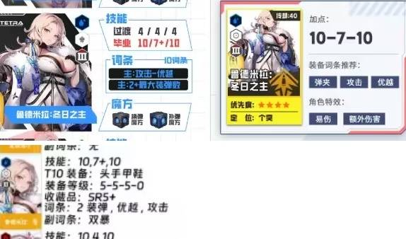 女王其实并不是特别吃装备和资源,技能前期4/4/4能用中期7/4/7过渡 毕业10/7/10即可,装备方面4件T10 词条方面强烈建议有两条最大装弹数,剩余追求一下攻优即可,不需要投入太多石头到女王的词条上。收藏品方面0级或者5级都可以 无需拉满。魔方方面建议补弹魔方。最近角色颇多还有黑莲这种吃资源大户,大家量力而行即可。