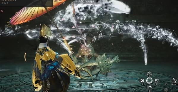 留意全身旋风就是要突进了,蝎子的攻击动作顺序为双手砸地一次、甩尾一次、远程蓄力突进一次,卸势后切换唐横刀特殊技打断,换成伞轻击蓄力逼退。