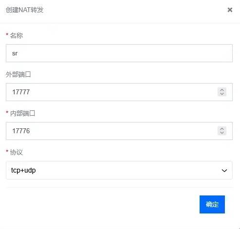 NAT转发>创建>外部端口:17777>内部端口:17776,协议:tcp+udp。