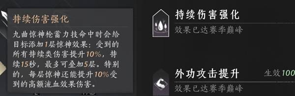 好了,讲完核心机制来源,接下来就要讲别的了,仅仅依靠着流血机制还不足以让九九的伤害达到现在pve中如此之高的地步,那么除了流血机制,是什么让九九伤害变得这么高呢?答案就是两个非常核心的buff机制:惊神和强效江流