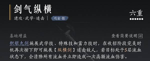 流血最多叠加五层,五层时会被纵横剑和特殊技引爆。纵横剑解锁来源于心法剑气纵横给予,如下图所示