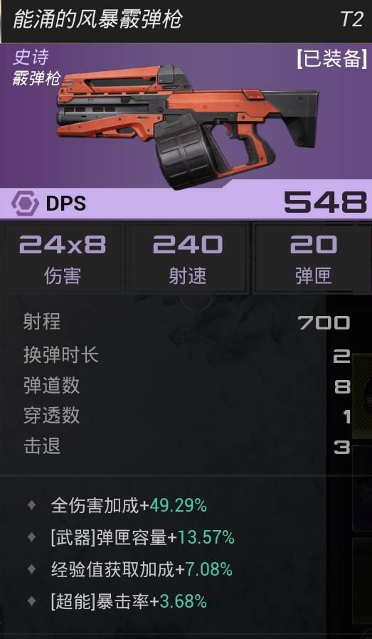 一开始感觉这个角色很垃圾,霰弹枪射速慢,换弹也慢,不知道怎么玩,后来直到我发现了上图这个武器,这个武器可以通过掉落和完成任务获得,脸不好的玩家使用克莱尔击杀5000敌人即可,霰弹枪有两种,一种是射速慢的一种是射速快的,这种霰弹枪攻击力虽然低,但是射速超级快,这就有了我们的BD思路,那就是靠射速来触发追击技能打输出。