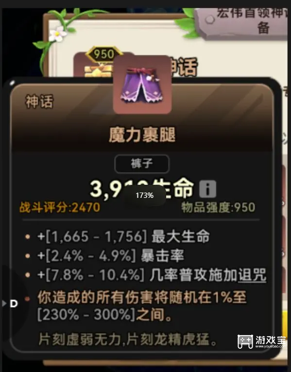 优势:魔力裹腿的随机增益机制使其具备顶级潜力,运气极佳时可打出爆炸性伤害,是追求极限爆发的玩家的首选。