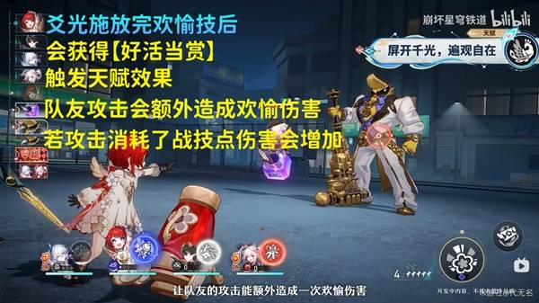对于欢愉队,爻光能帮助累加【笑点】,终结技提供的额外的【阿哈时刻】,让欢愉时刻连续行动,增强队伍爆发
