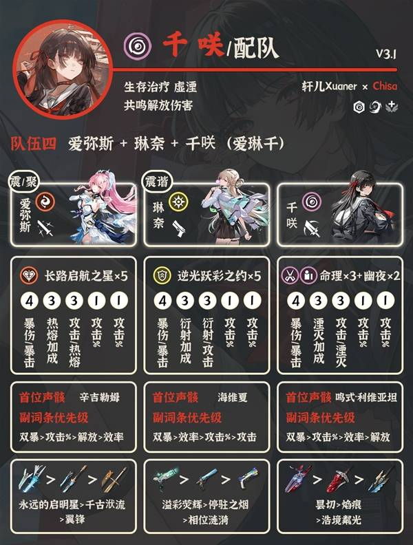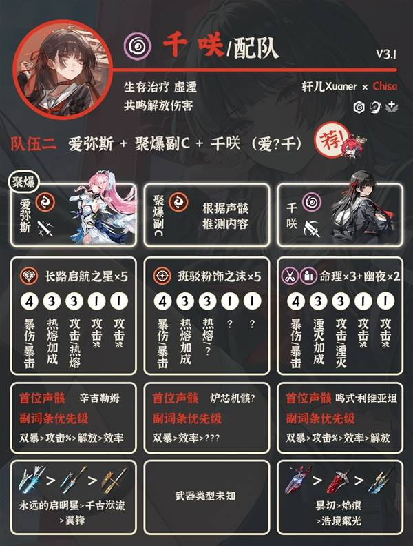 ②爱弥斯+聚爆副C+千咲:需要等聚爆副C组完整聚爆队,预期也是顶级队伍。没有琳奈莫宁,抽了爱弥斯的漂泊者可以考虑。
