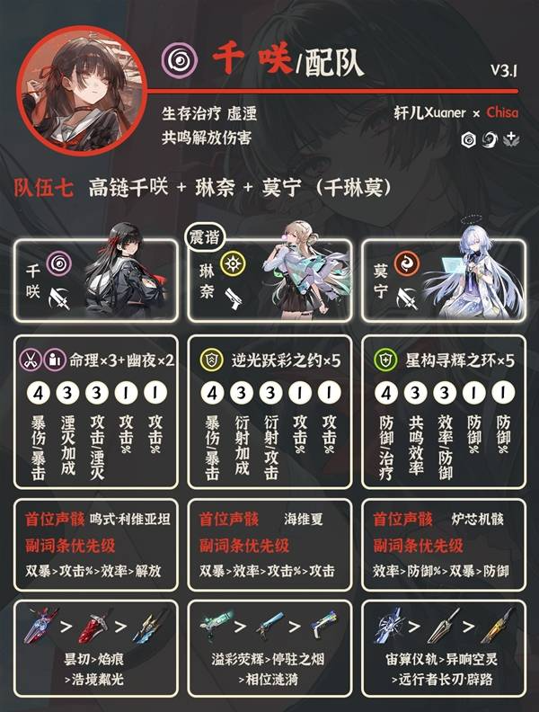 ⑦高链千咲+琳奈+莫宁:抽了高链千咲的厨子想用来做主C可以用这套,琳奈莫宁提供非常可观的增伤,琳奈延奏可以加共鸣解放加深给千咲吃。