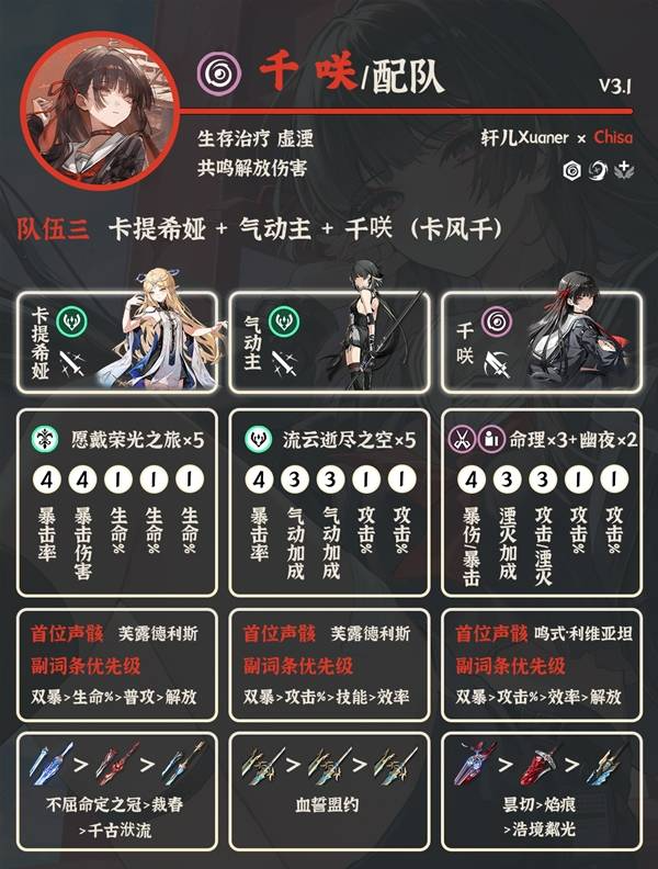 ①卡提希娅+夏空+千咲:当前版本千咲最佳配队。卡夏千是目前鸣潮顶级队伍,千咲有专武更好,没有专武的话千咲也可以用气动主代替。