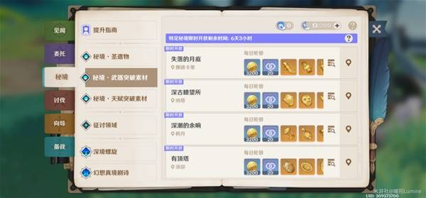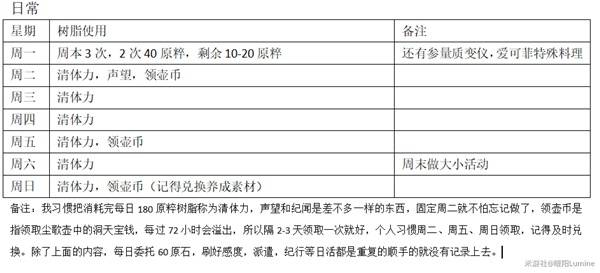 我目前的账号养成规划呢,一个小版本42天,只有「幽境危战」紊乱爆发期10天和提前准备的须臾树脂和5个浓缩树脂去刷圣遗物,其他的树脂用来刷其他的养成材料(突破材料、经验书、摩拉、武器突破/天赋书),上下半卡池更新后,首周武器突破/天赋突破素材秘境限时开放,比较建议去刷突破素材,就不用刻意去记周一到周日可以刷哪些素材,其他时间我一般是打地脉花和打boss领角色的突破材料和石头,都是比较灵活安排。
