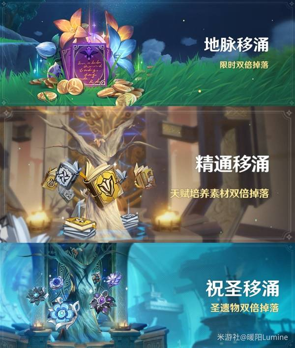 版本最后一周的限时双倍掉落活动(3种种移涌),每日定向送的双倍掉落,60原粹树脂优先用完,其他的结合自己的需要去使用,我一般是刷地脉花攒摩拉和经验书给新版本抽的角色用。