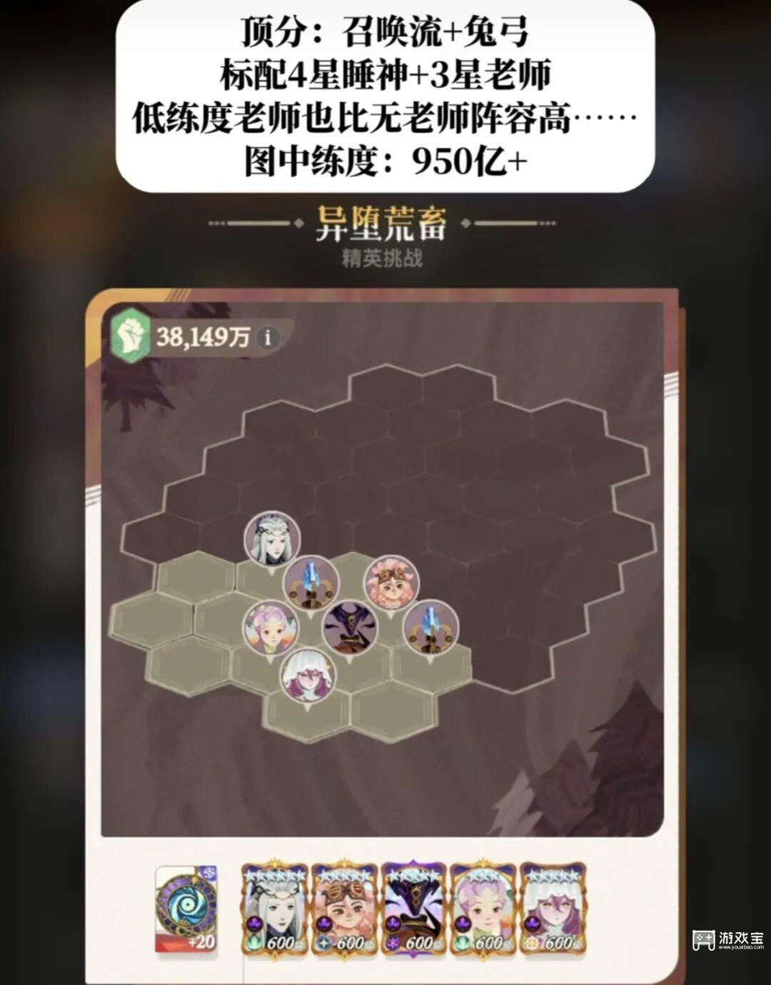 3、兔弓+三星老师+四星睡神是这个阵容的关键,练度越高出分越高。
