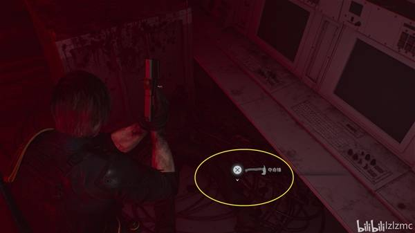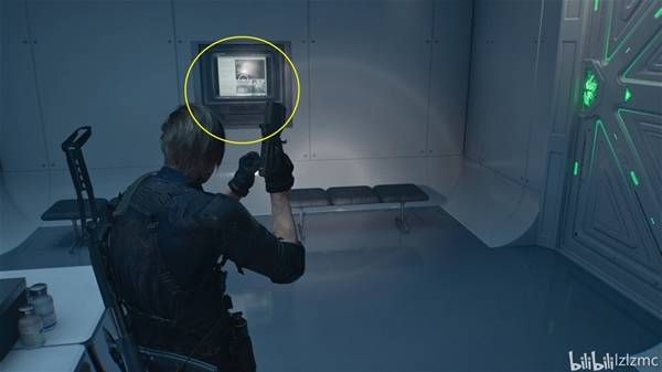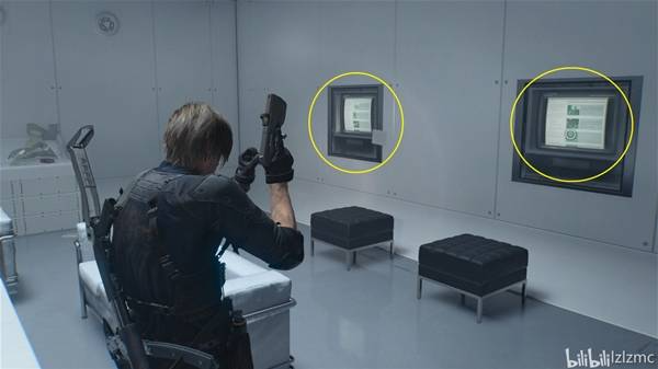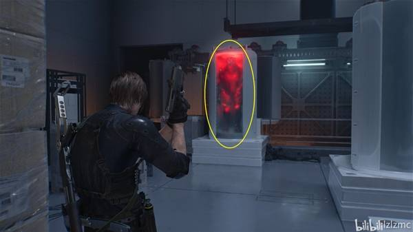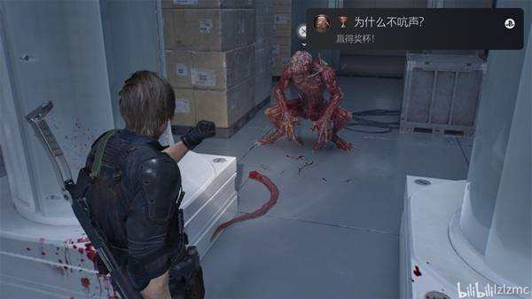 战斗结束后,来到如图位置,这里有一个生物武器舱,里面有一只舔食者,手枪打碎玻璃放出舔食者。在它吐舌攻击要打到你的瞬间用斧子L1招架触发弹反,弹反攻击成功能割掉舔食者的舌头,获得奖杯:为什么不吭声?。舔食者的吐舌攻击,进攻前会出现一个舔舌头的动作,其他攻击也可以弹反或者躲开都行。打完向左上楼梯可以去员工室整理一下,护甲要修。