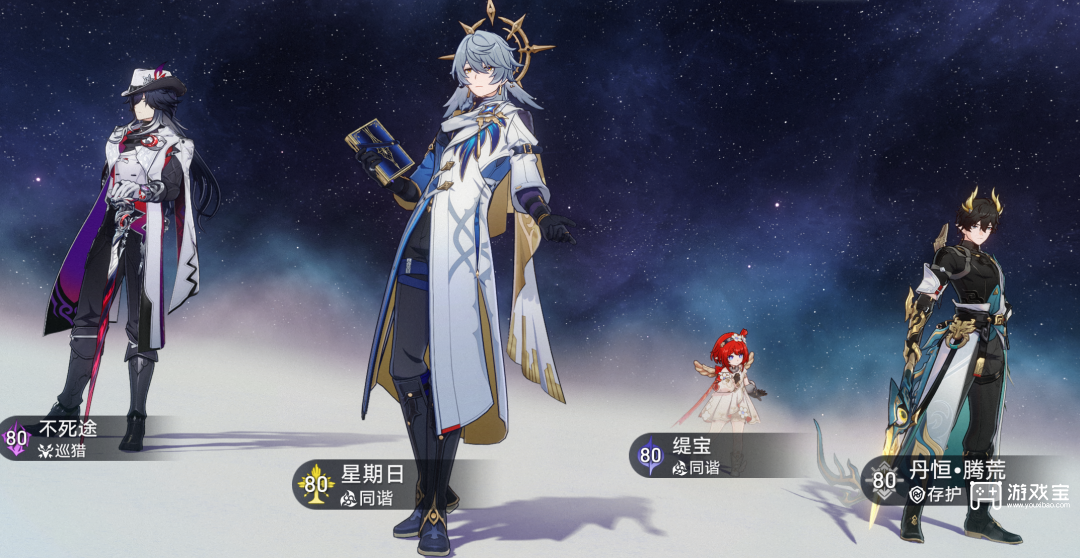 星期日+丹恒·腾荒是辅助单C非常好的组合。最后一名队友要选能高频攻击敌人的角色,才能触发不死途的天赋追加攻击,缇宝就很好。