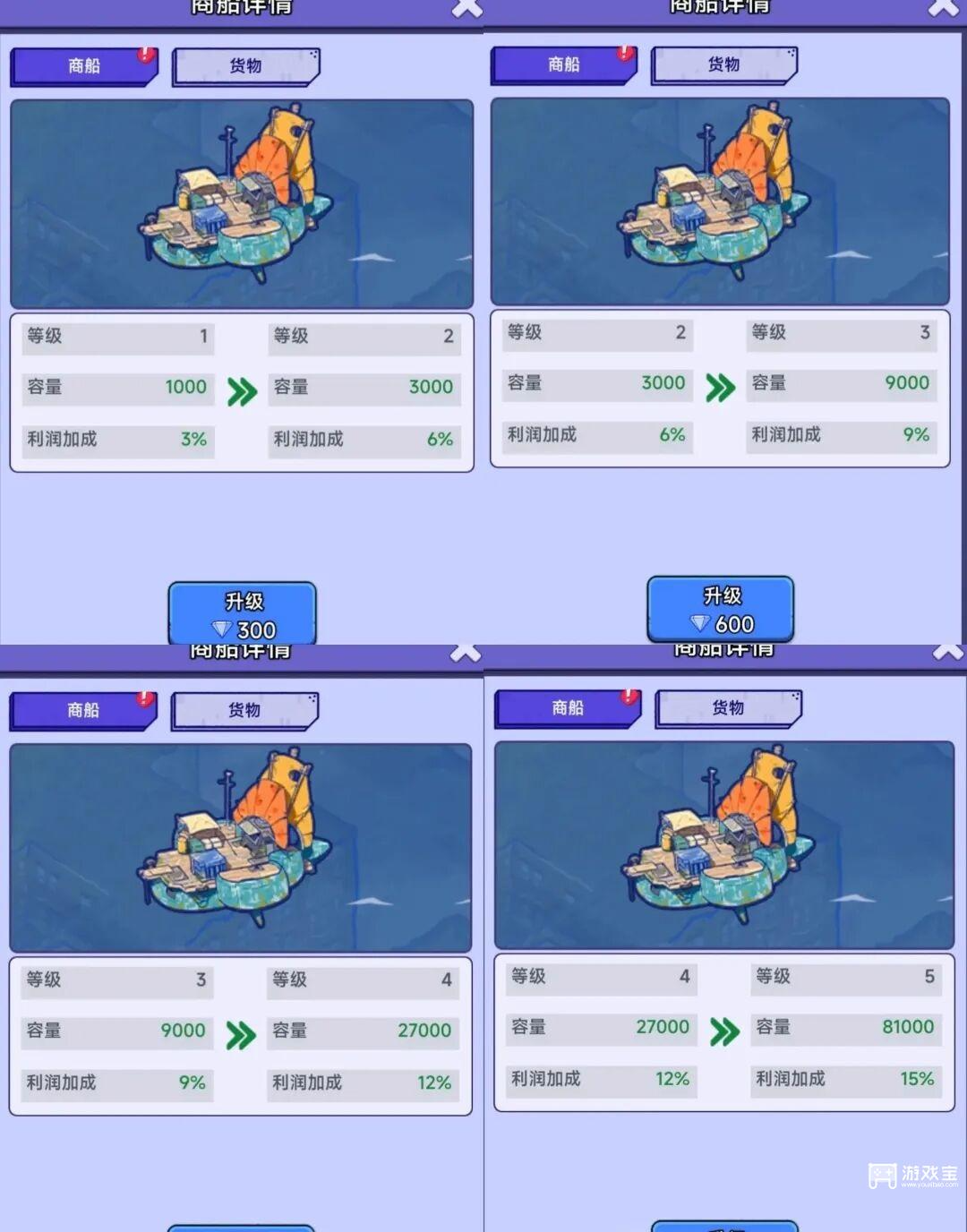 1.商船等级:商船升级可提升船舱容量及利润加成,所以商船在达到前置利润条件后必须第一时间进行升级。升至满级共需要花费4100钻石。