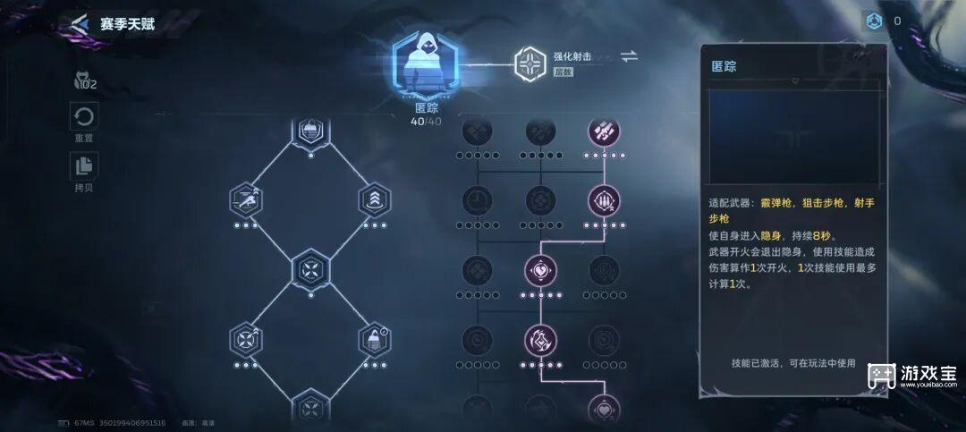 匿踪开启后自身隐身8秒,附带移速提升、规避锁定与缓慢回血。进阶后为遁形,前5-9次开火不显性且必暴击,弱点伤害大幅提升,还可叠层增伤、返还技能充能 。搭配刺隐时,隐身可安全贴脸BOSS,规避高伤技能,破隐与前几发必暴击能瞬间打满爆发,完美契合近战贴脸输出流派,大幅提升生存与攻坚能力。