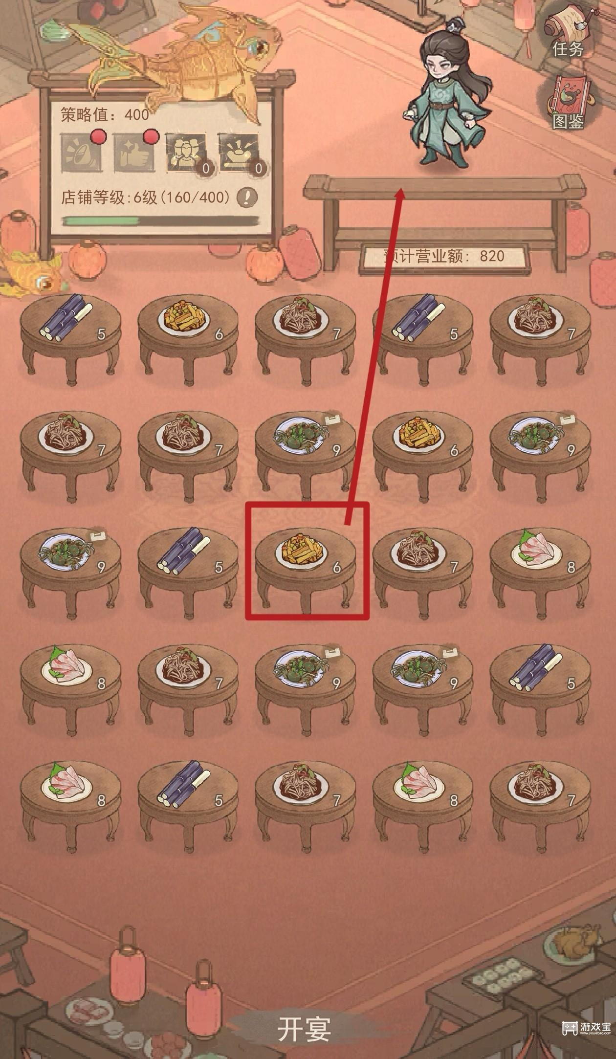 宴楼等级4-6级时,积累了一定策略值,继续使用“有口皆碑”;营业额较高的阶段选“价高者得”(营业额增加25%)能显着提升宴会宝钱和策略值;结合“店内动员”:行动点紧张时,增加操作空间。