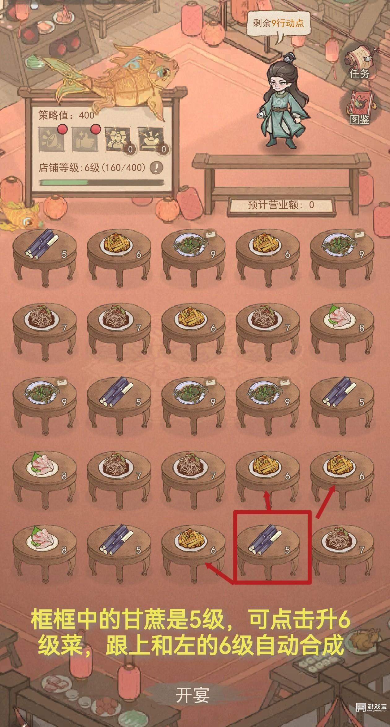 宴楼等级1-3级时,策略值有限,首选“有口皆碑”(基础经验+15)更快提高等级;多余策略点可辅助选择“店内动员”(额外获得2点行动点)增加菜品升级和合成机会。