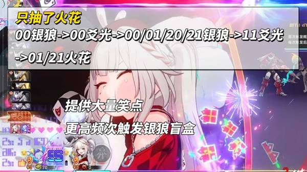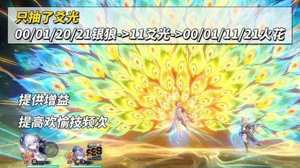 ③只抽了火花。可考虑先抽个00银狼,并预留1金等待未来爻光复刻抽其本体,现阶段先“银狼+火花+欢愉主+藿藿”。00银狼->00爻光->00/01/20/21银狼->11爻光->01/21火花。