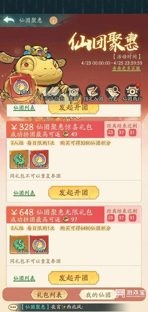 仙团聚惠是寻道大千手游中的团购类限时活动,每2-3个月开启一次,持续3天。活动核心机制为组队拼团购买礼包,通过返利机制和积分兑换,具体玩法可以参考寻道大千仙团聚惠活动详细攻略。