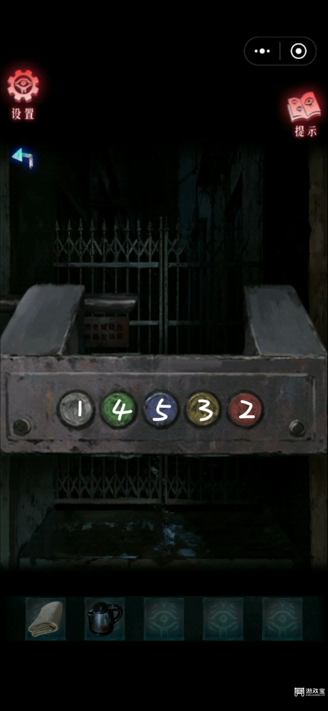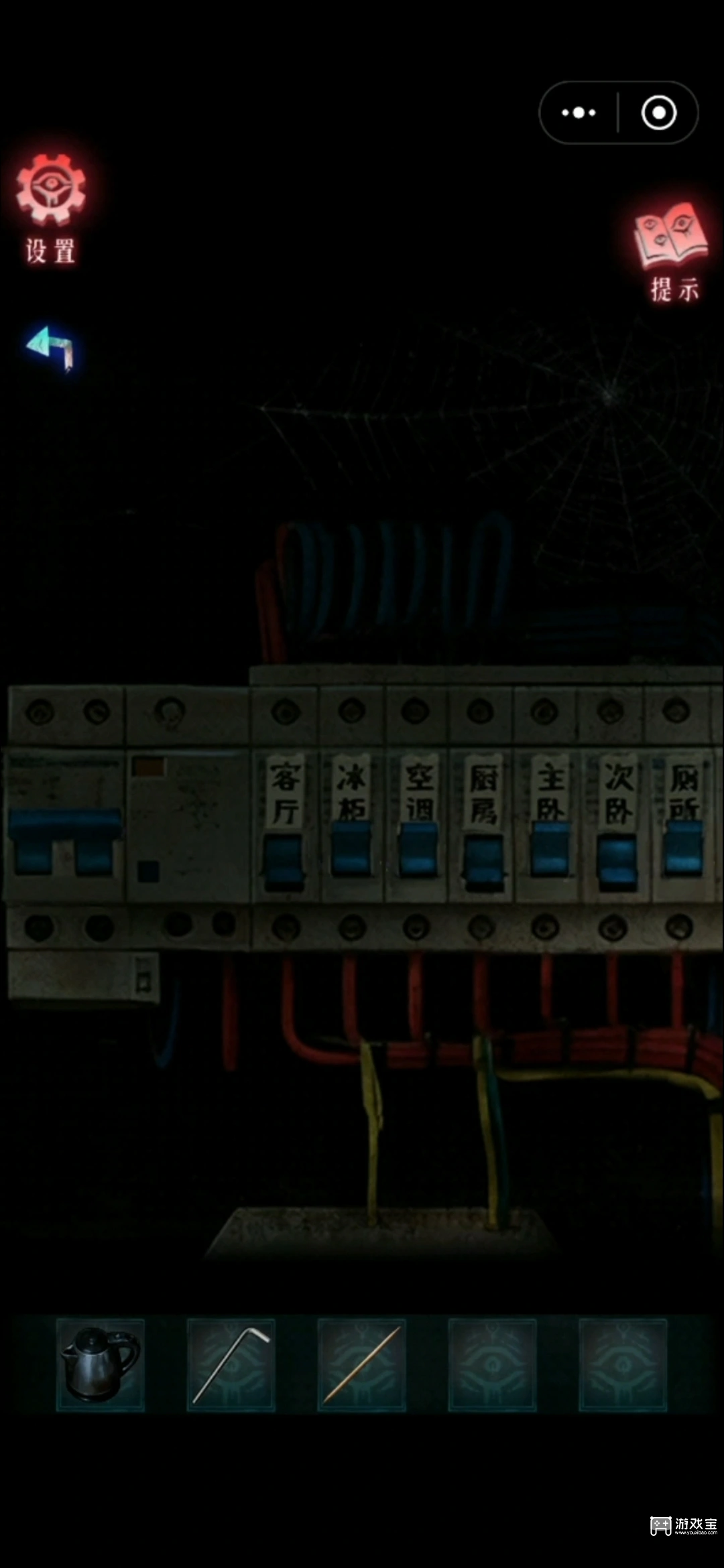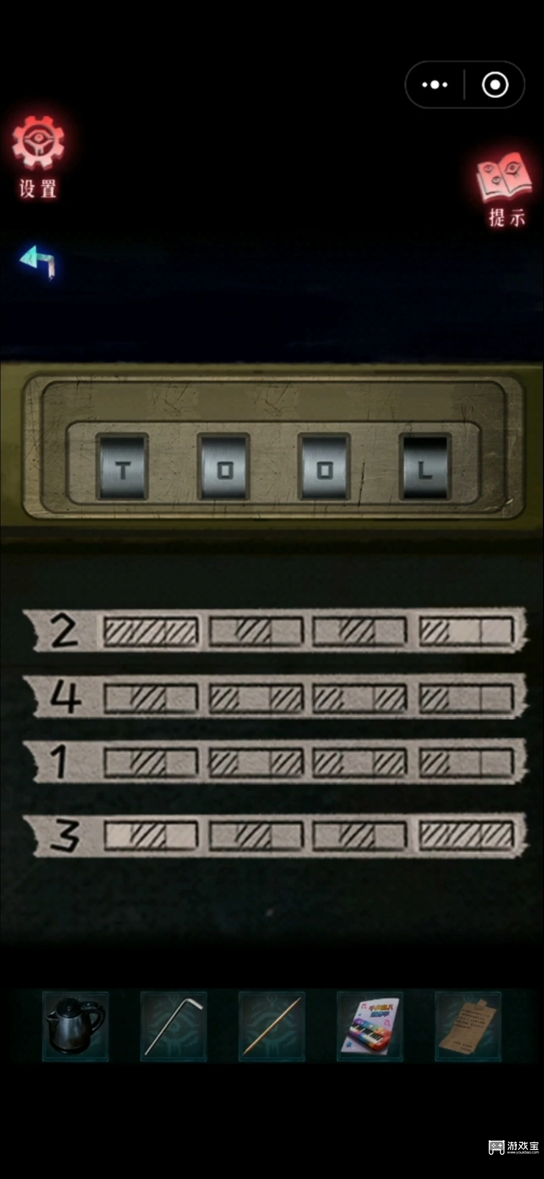 13、进门后随便点点,从兰清处获得一张便笺,用锤子和扁头螺丝刀撬开电箱,根据便笺和儿童电子琴教程的线索调整电箱按钮,如图。