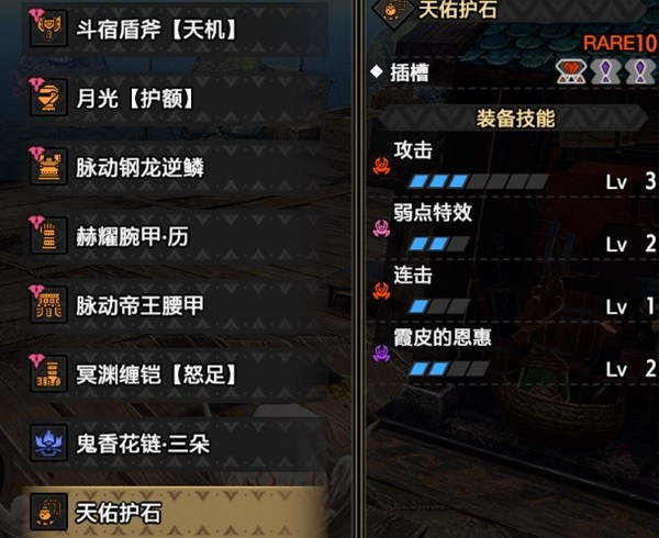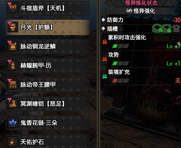 怪异槽扩充Lv6(攻击力+30、锋利度+10)+攻击力强化Lv2(攻击力+10)+百龙装饰槽Lv扩充Lv1(百龙装饰品Lv+1)
