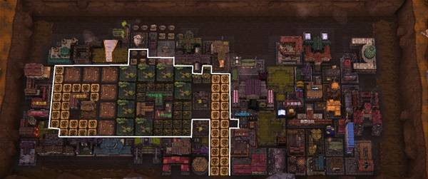 全建筑拿到后随便摆了一下,如图。白色区域为采集活动区,其他关键加成的建筑大概标注了一下供大家参考。