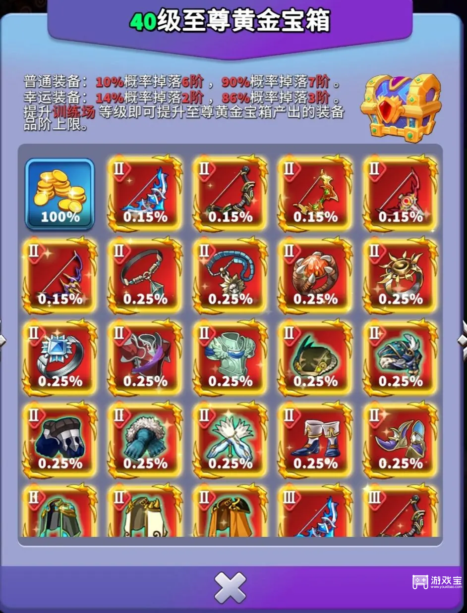 另外训练场满级是40级,13级训练场之后,每升一级,增加1%概率3阶,减少1%概率2阶幸运装备,后续提升效果小,如果足够能忍,建议等13级训练场再开宝箱,实现质的飞跃!