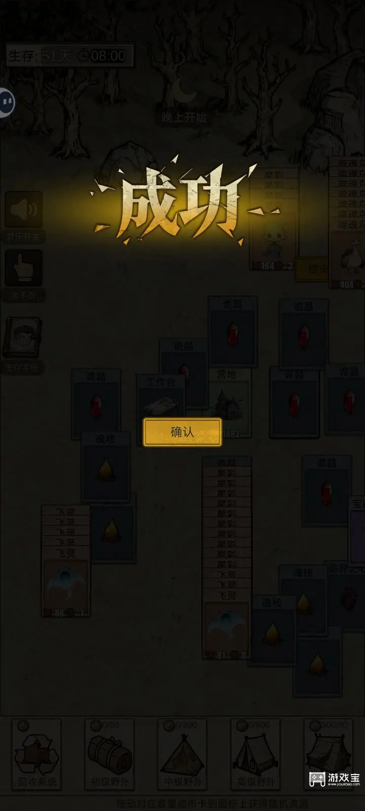 并在夜晚使用诡怪战斗,战斗胜利获得物资,失败则减少营地生命值,营地生命值归零游戏失败,未被攻破的情况下存活五十天后获得游戏胜利。