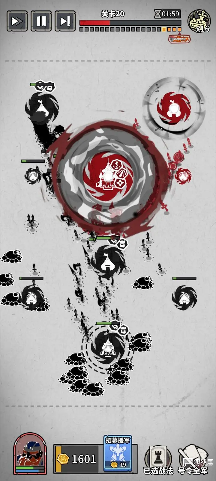 11、[兵法:趁虚而入]:当敌方据点兵力有损耗不满时,小兵围绕据点周长转圈,围不成一个周长,会有空隙。如果我们的小兵进攻点位就在那个空隙上,那么就直接磨掉敌方据点的血。因为对面小兵没碰到我们的兵。