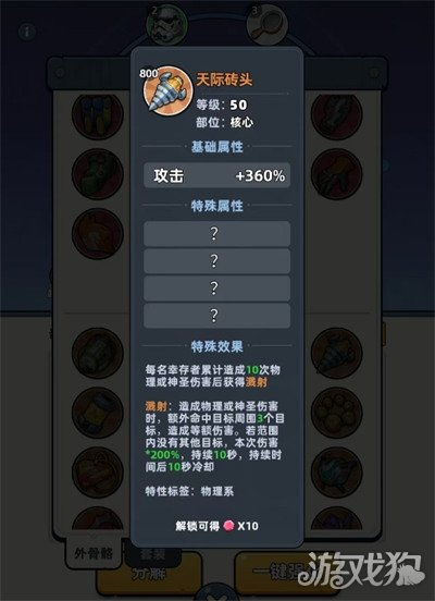 但要知道,天际砖头是最低品质为橙品的外骨骼核心,所以它在前期无法获得,只有将秘境试炼通关至61层后,才能解锁天际砖头的掉落。因此,在外骨骼核心的选择上也分为两个不同的阶段,若玩家们的主力幸存者主打物理或神圣伤害,那边便可在秘境试炼61层之前,使用任意高数值的核心来过渡,等自己能打过秘境试炼61层并获得天际砖头,只用天际砖头作为自己在外骨骼核心上的唯一选择。